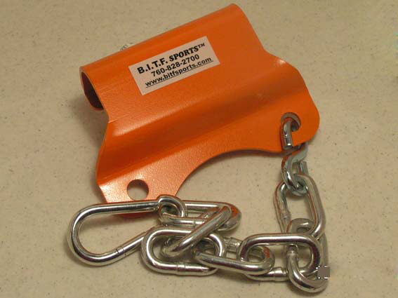 Perform monster T-bar rows for a fraction of the cost of those bulky, inflexible factory units, using less floor space! The perfect part to add to your home fitness equipment. More importantly for serious strength training, you are no longer restricted to the one bar that is permanently attached to those floor units. Our adapter allows you to use virtually any bar up to 1.75” in diameter in conjunction with any barbell. You can even use pull-down bars with fat, swivel cable attach brackets or canted curl bars. No more limitations! Crush your lats from every angle. Simple design is easy to use and extremely strong. Made from 3/16" laser cut steel and 1/4" proof coil chain. Finished in bright orange powder coat. All our parts come with a 30 day satisfaction guarantee and one (1) year warranty. For the greatest workout deal on this part and best package discount, check out our "Caveman" back & core training system!